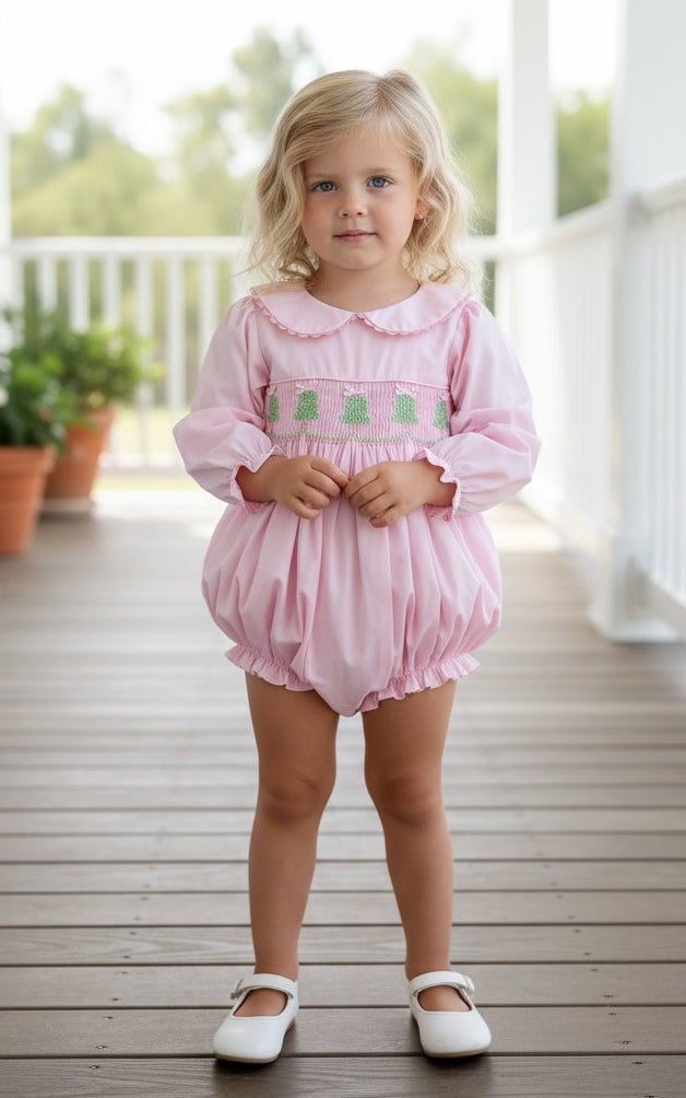 This is a beautiful bubble romper. The Santa hat has a white pompon at the tip. Good quality fabric. There are white bows at the side of legs… just perfect for a little girl. Everything is more than what I anticipated for my first time purchasing clothing from Etsy. Thank you so much!