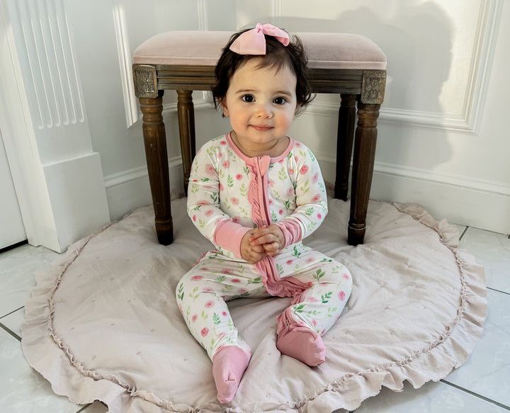 Our Alice Floral Ruffle Footie is soft and perfect for all seasons! Diaper and outfit changes are a breeze with the double zipper. Plus, adjustable cuffs for easy hands and feet coverage.