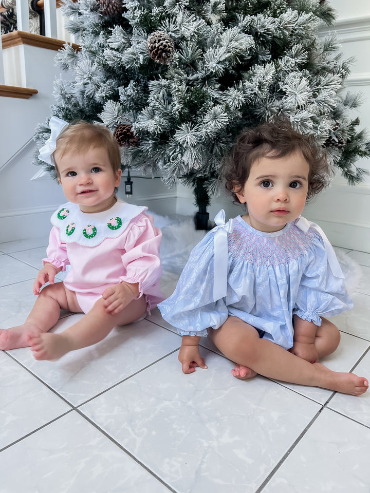 A sweet winter themed pattern of bows, wreaths, and trees in our classic bubble style with pink smocking and white satin bows to top off this holiday season's outfit!
