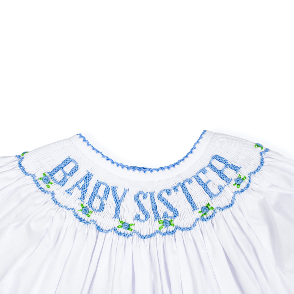 This adorable white smocked dress is perfect for any new baby sister. Features a delicate hand embroidery rose bud detail. The dress also has a ruffled hem and a sweet "baby sister" print on the front. This dress is sure to be a cherished keepsake for years to come.