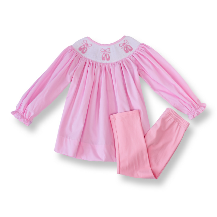 A long sleeve pink shirt with darling embroidered ballet slippers and matching leggings!