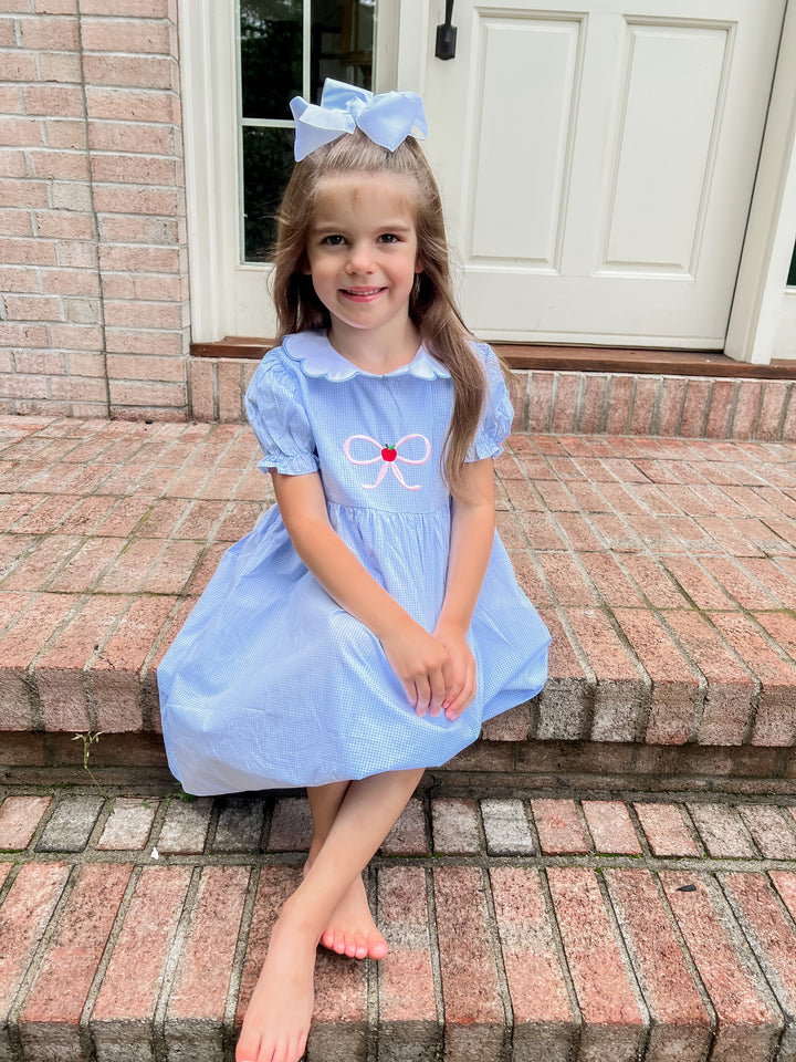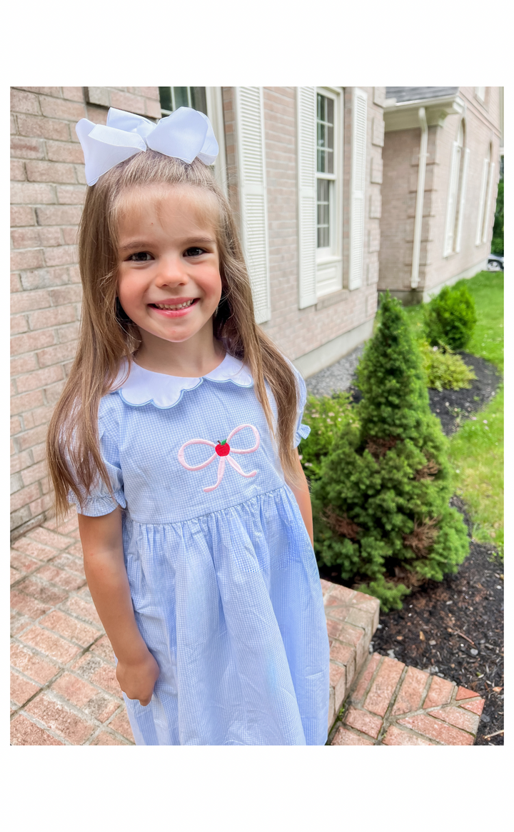 Our Blue Gingham Apple Bow Dress is a timeless pick for the first day of school. Featuring a scalloped white collar, puff sleeves, and an embroidered red apple with a pink bow, this dress is as charming as it is classic. The light gingham pattern and soft cotton blend keep your little one comfy from morning drop-off to after-school fun.