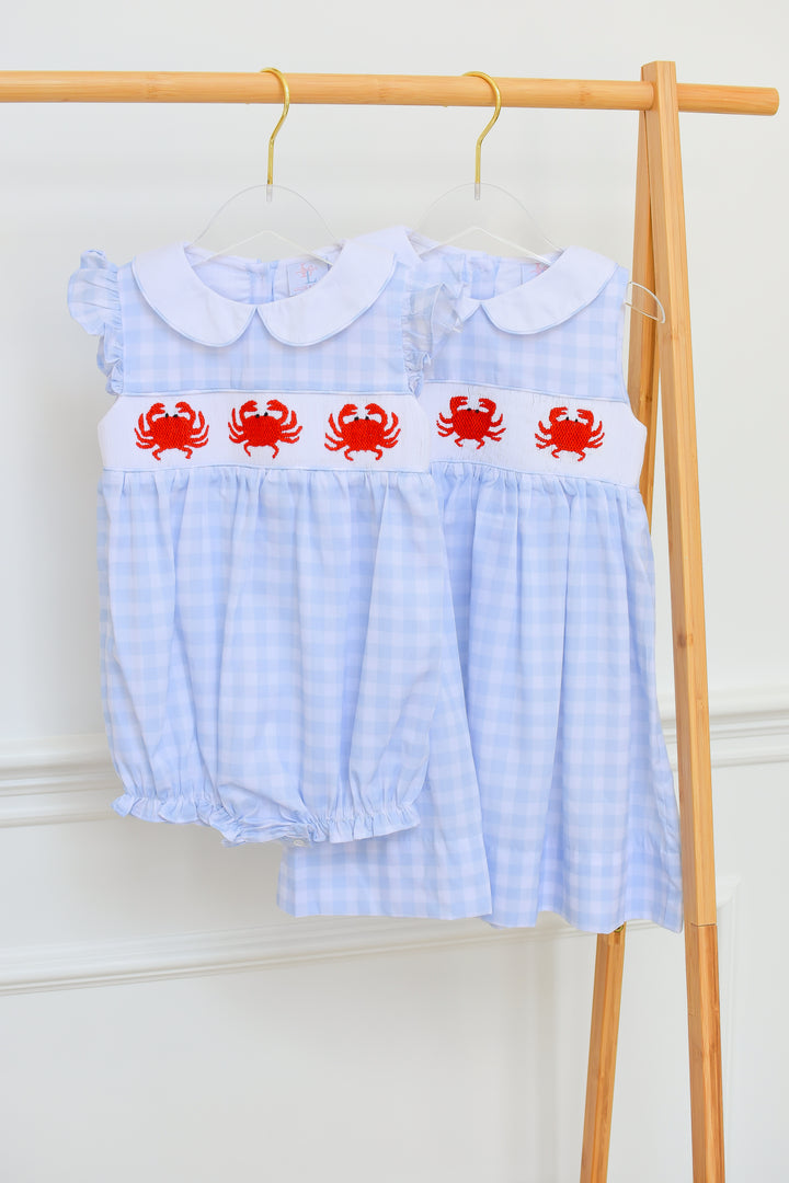 Perfect for seaside adventures, our girls crab smocked dress features bright red hand-smocked crabs on a light blue gingham backdrop. Finished with a crisp white Peter Pan collar and full pleated skirt, it’s a classic coastal look for beach vacations, picnics, and summer celebrations.