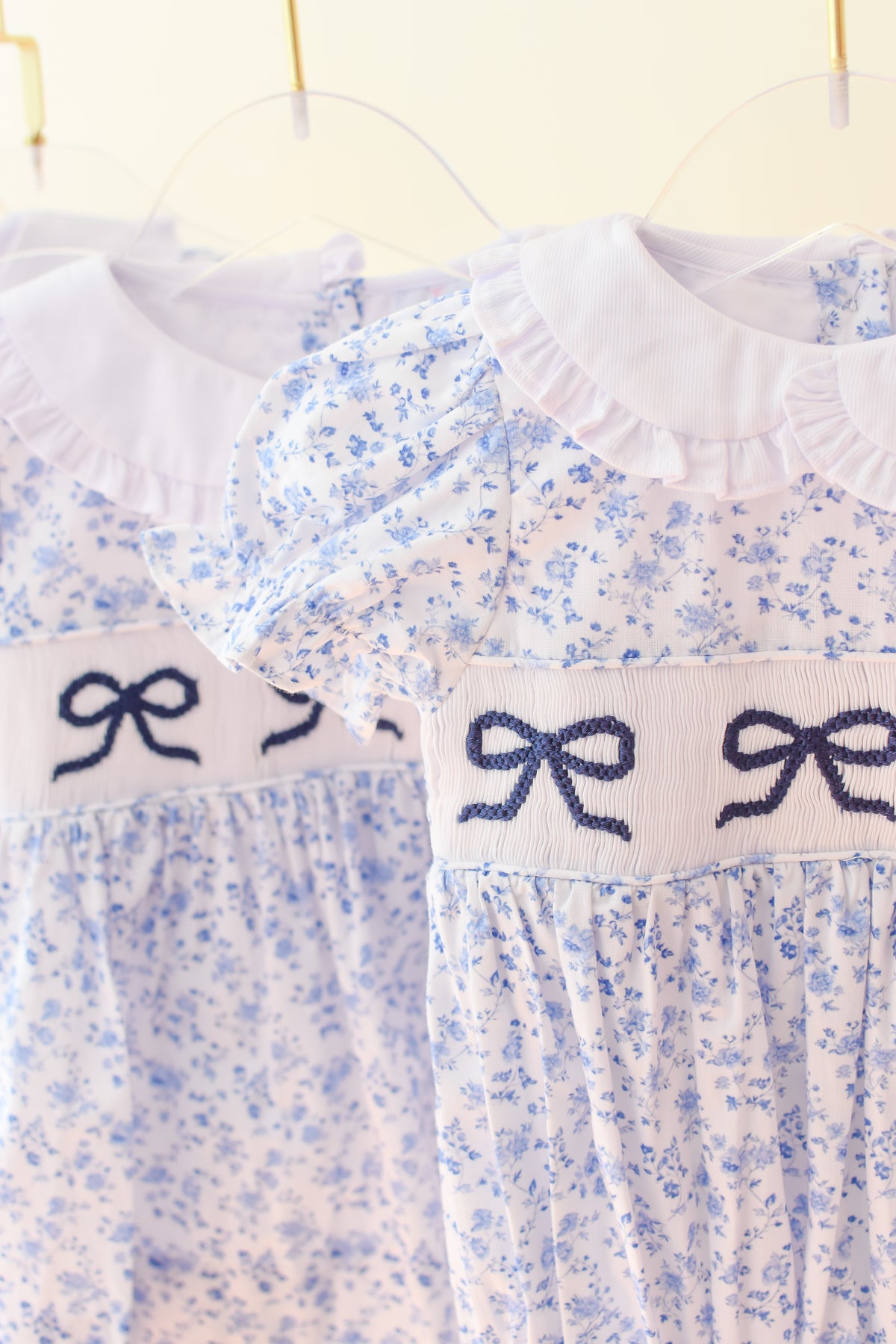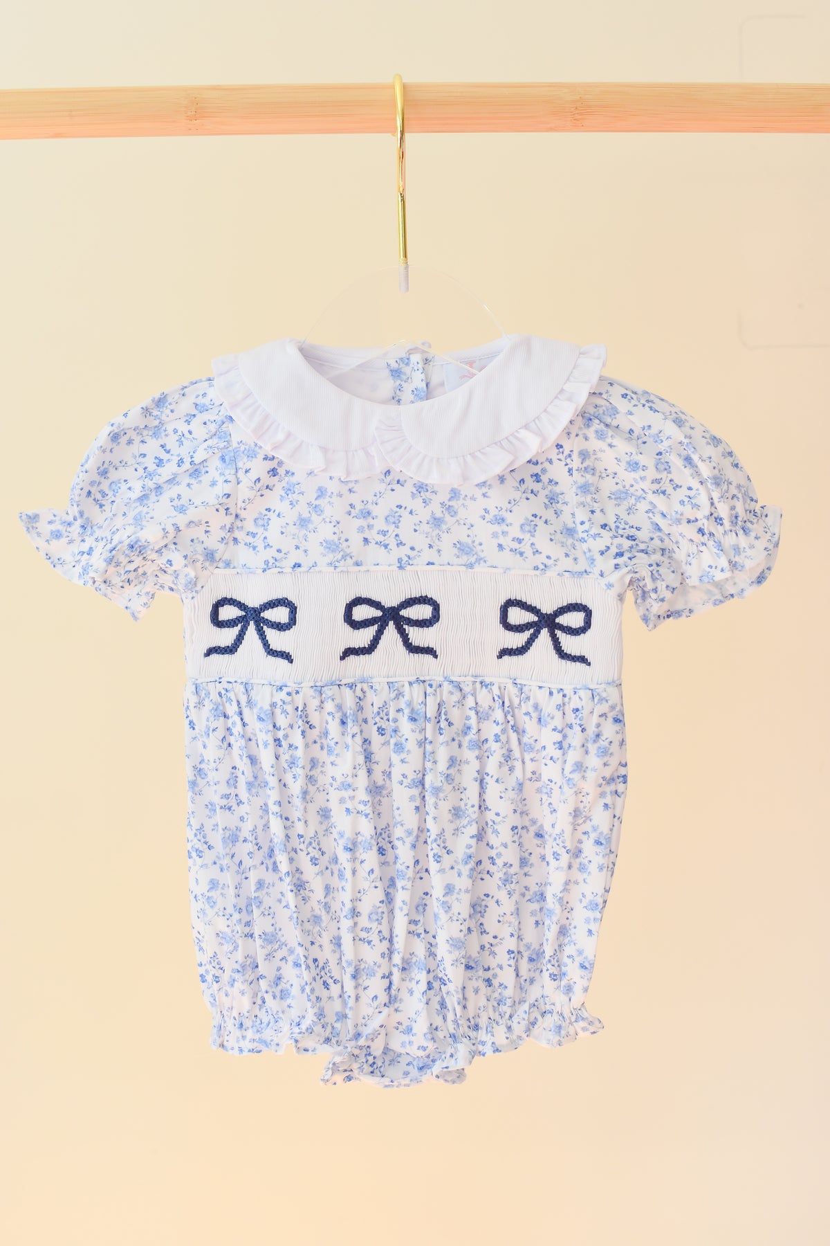 This Girls Blue Floral Bow Smocked Bubble is perfect for your littlest sweetheart. Designed with a soft blue floral print, puff sleeves, and a classic white Peter Pan collar, this bubble features hand-embroidered bows across the smocked chest and ruffle-trimmed leg openings. A timeless heirloom look for special occasions, sibling sets, or everyday charm.