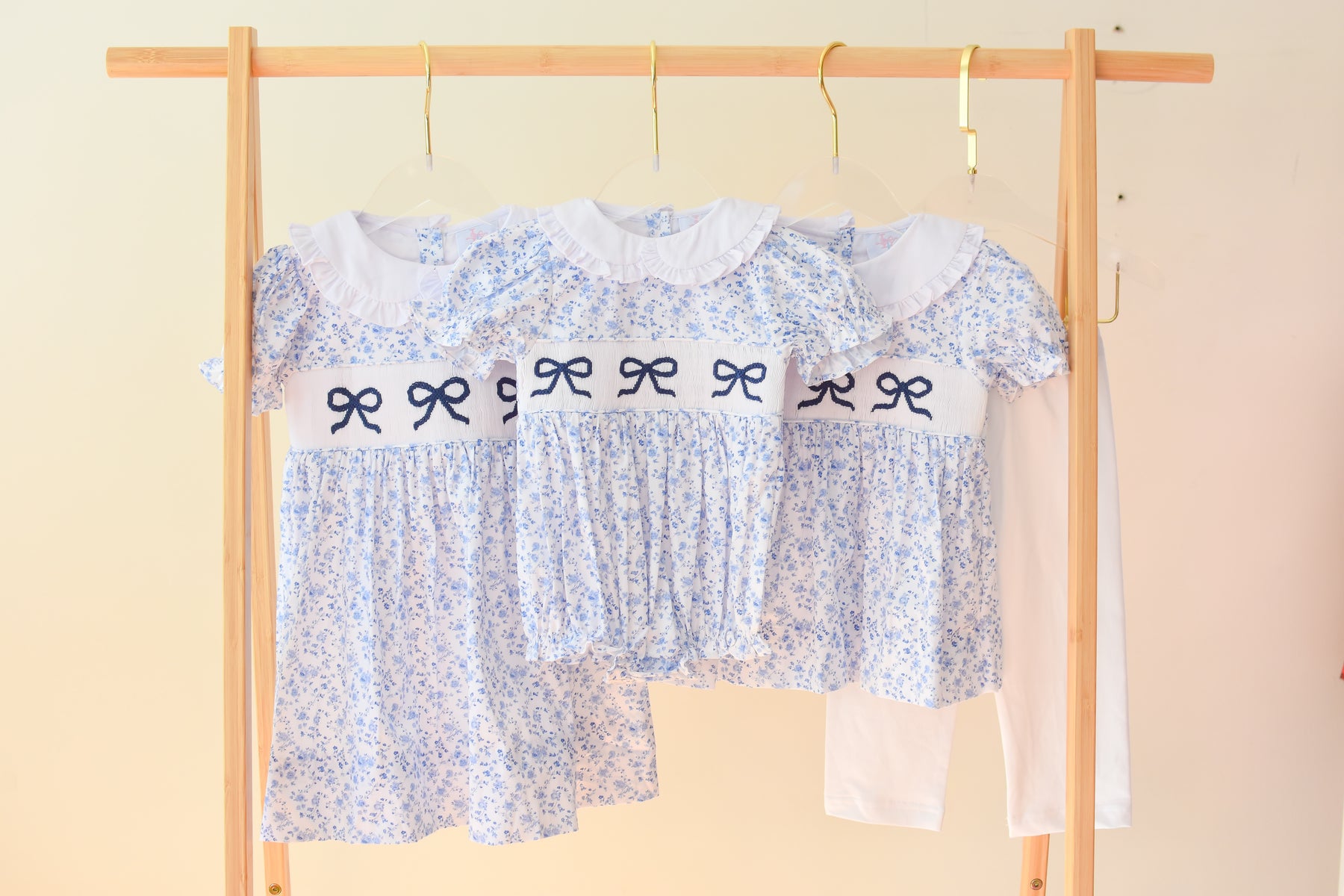 This Girls Blue Floral Smocked Dress is a timeless classic with a fresh twist. Featuring a delicate blue floral print, puff sleeves with ruffle trim, and a crisp white Peter Pan collar, this dress is topped with beautifully hand-embroidered bows across the smocked bodice. Perfect for church, birthdays, portraits, or any sweet occasion, it's a must-have for any little girl's wardrobe.
