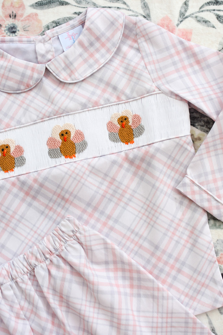 Perfect for fall festivities, our Boys Plaid Turkey Smocked Shirt & Shorts Set features a soft neutral plaid, hand-smocked turkeys, and a classic Peter Pan collar. This charming long sleeve top and matching shorts set is ideal for Thanksgiving dinners, family photos, and cozy seasonal celebrations. A timeless outfit for your little gentleman!