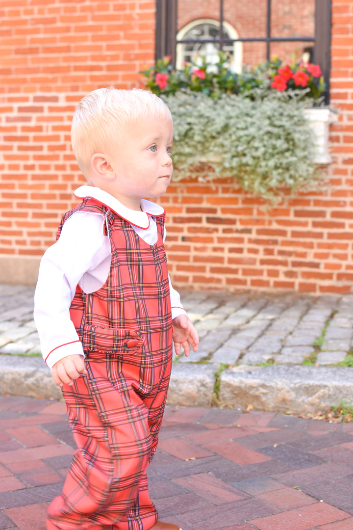 This timeless boys’ holiday outfit features a red and green plaid longall with button tab details, paired with a white long sleeve shirt trimmed in red piping and a sweet Peter Pan collar. Perfect for Christmas gatherings, holiday portraits, and seasonal celebrations, this heirloom-quality set is designed for both comfort and style. Snap leg closures make for easy changing, while the traditional look keeps your little one festive and photo-ready.