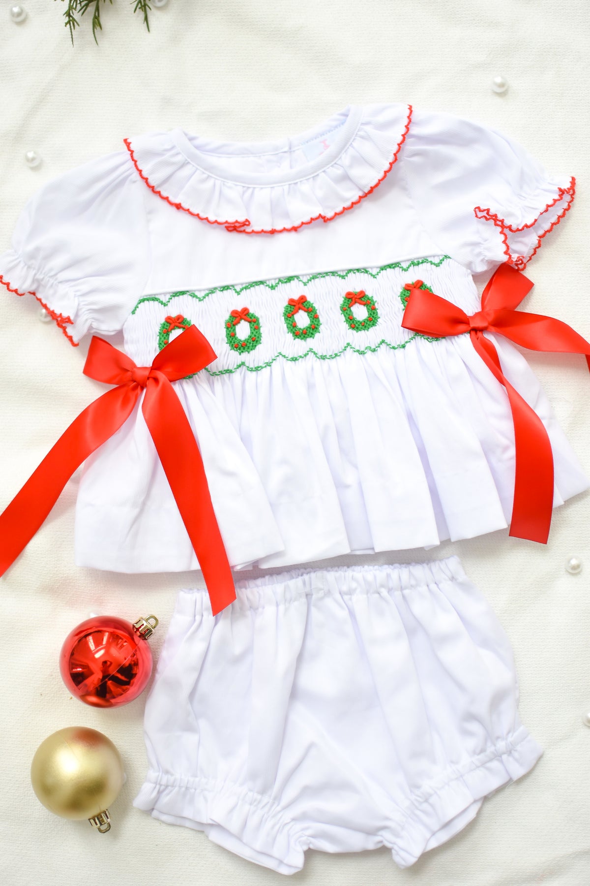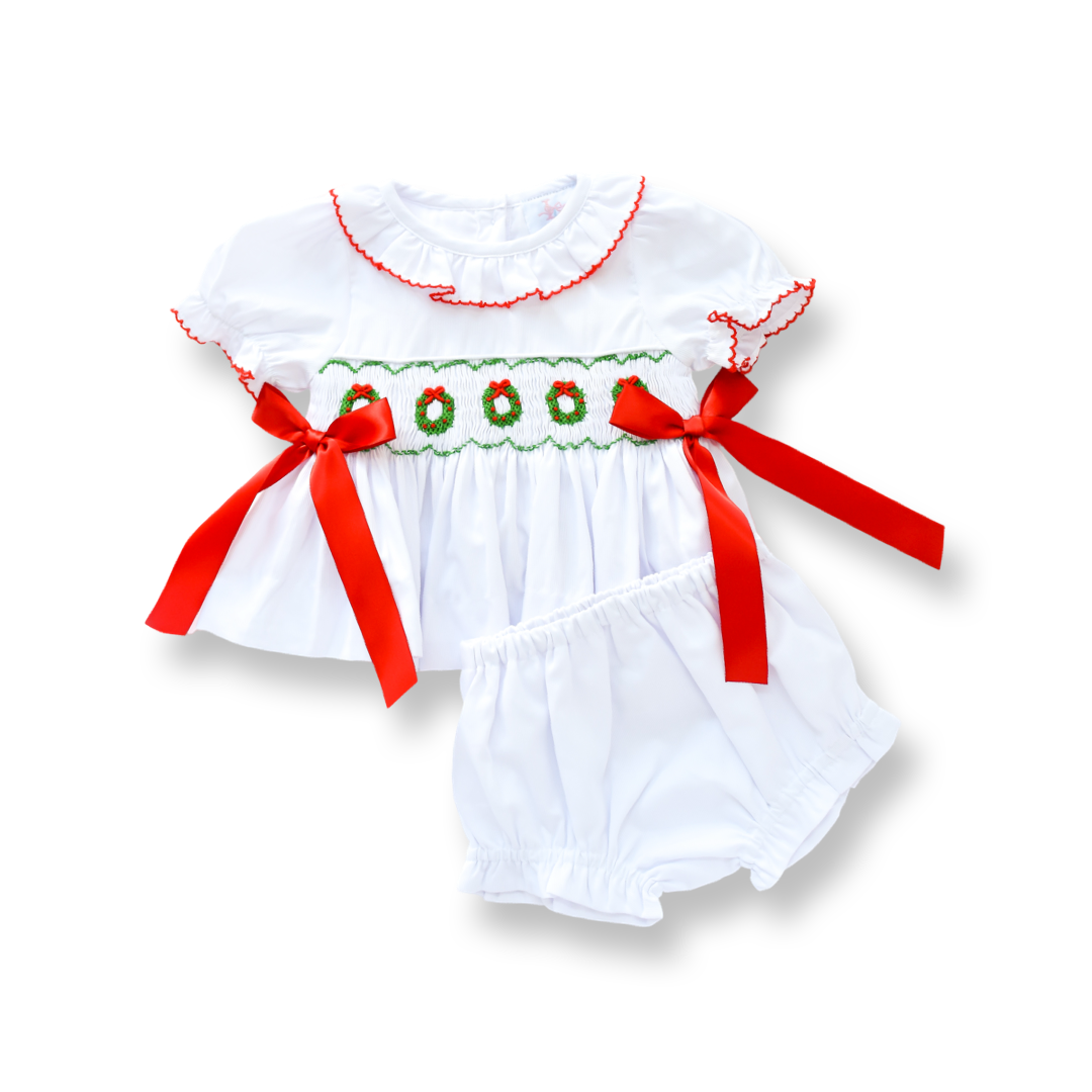 This sweet holiday bubble set features hand-smocked green Christmas wreaths, red and green trim, and charming puff sleeves with delicate red bows. Paired with matching ruffle bloomers, this classic white outfit is perfect for baby girls celebrating their first Christmas. Ideal for festive photos, holiday parties, and family gatherings, this heirloom-style outfit brings timeless charm to every celebration.