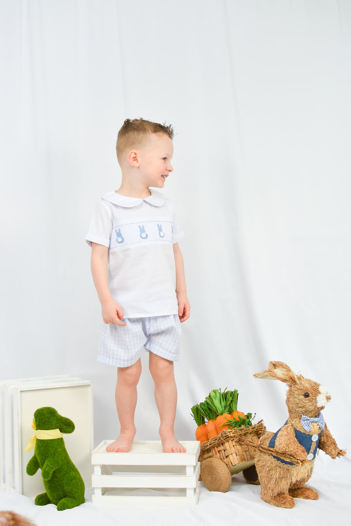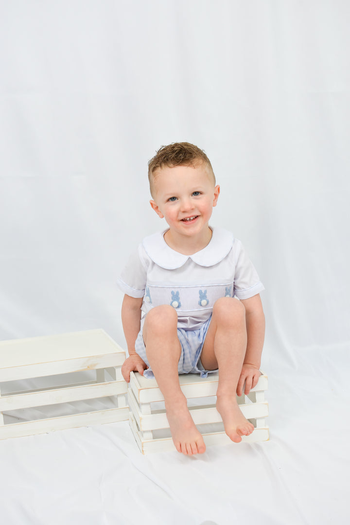 The Blue Gingham Boy Bunny Smocked Short Set is a charming and classic outfit, perfect for Easter celebrations and springtime festivities. Featuring intricate hand-smocked detailing with adorable bunny embroidery, this set brings timeless tradition to your little one's wardrobe. The soft blue gingham fabric adds a fresh and playful touch, while the lightweight, breathable material ensures all-day comfort. The coordinating shorts create a polished yet effortless look, making this outfit ideal for Easter egg hunts, family gatherings, and seasonal photos. Designed for both style and practicality, this beautifully crafted short set is a must-have for the season.