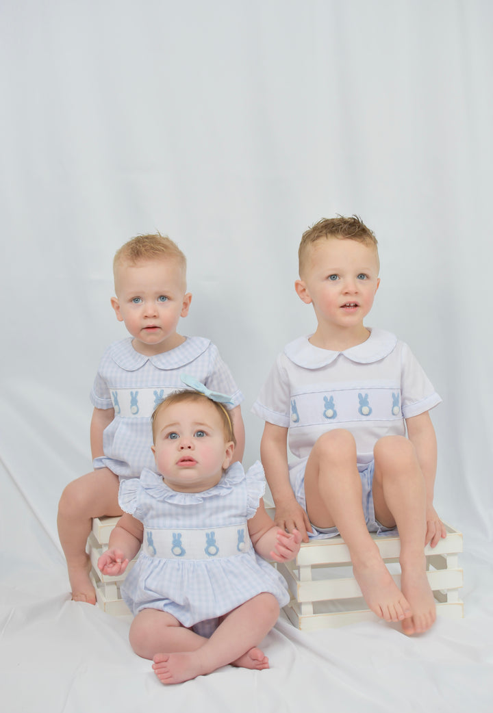 The Blue Gingham Easter Bunny Smocked Boy Bubble is a timeless and adorable outfit, perfect for celebrating Easter and the beauty of spring. Featuring delicate hand-smocked embroidery with charming bunny details, this classic bubble blends tradition with a playful touch. The soft blue gingham fabric adds a fresh, seasonal feel, while the lightweight, breathable material ensures all-day comfort. Designed with a gently tailored fit and heirloom-quality craftsmanship, this bubble is ideal for Easter egg hunts, family gatherings, and capturing precious moments. A must-have for any little gentleman’s wardrobe, this outfit brings both style and charm to the season.