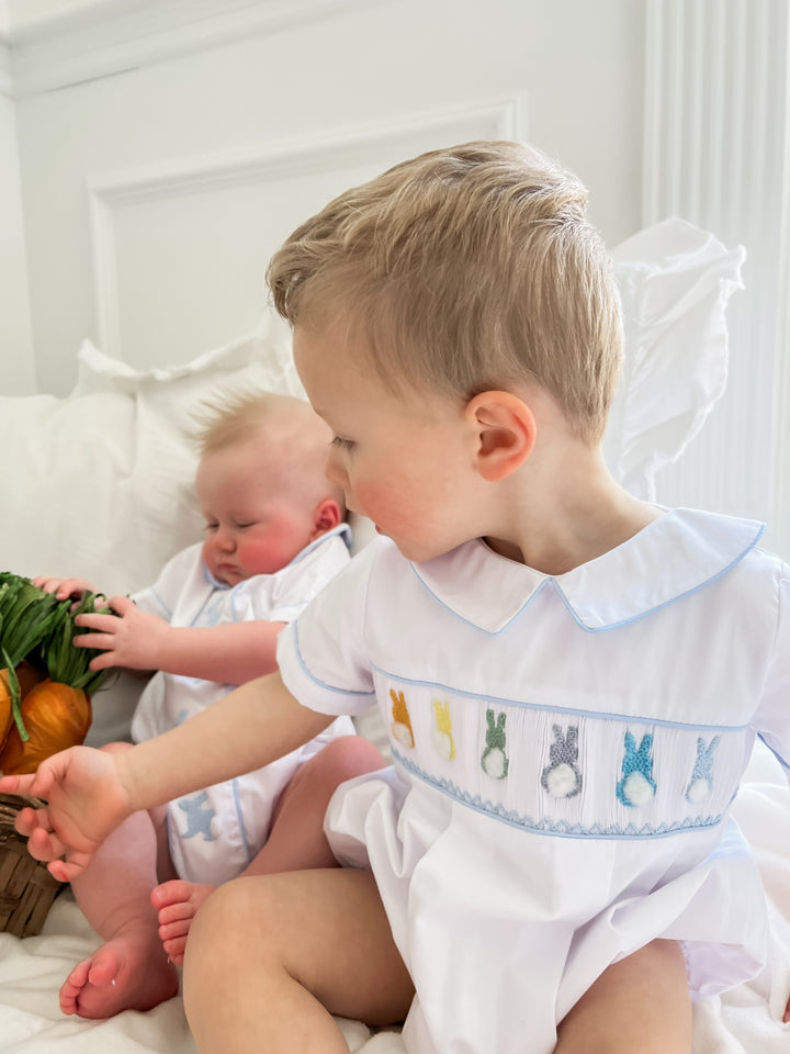 The Caleb Colorful Bunny Bubble is a fun and festive outfit, perfect for Easter and springtime celebrations. Featuring bright, colorful bunny embroidery, this bubble brings playful charm to your little one’s wardrobe. The soft fabric ensures comfort for all-day wear, while the lightweight material keeps them cool and cozy during seasonal outings. The buttoned shoulders and gently gathered fit add both style and practicality, making it ideal for Easter egg hunts, family photos, and spring gatherings. This beautifully crafted bubble combines style, comfort, and joy, making it a must-have for your little boy’s wardrobe this season.