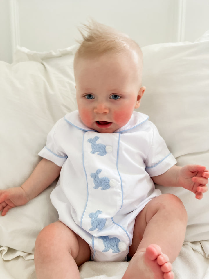 The Boy Bunny Cotton Tail Bubble is a charming and playful outfit, perfect for Easter and springtime celebrations. Featuring hand-smocked embroidery with a cute cotton tail design, this bubble adds a whimsical touch to your little one’s wardrobe. The soft fabric ensures comfort for all-day wear, while the lightweight material keeps them cozy and cool during seasonal outings. The buttoned shoulders and gently gathered fit make this bubble both practical and stylish, making it ideal for Easter egg hunts, family photos, or special occasions. This beautifully crafted bubble is a must-have for your little boy's wardrobe this season.