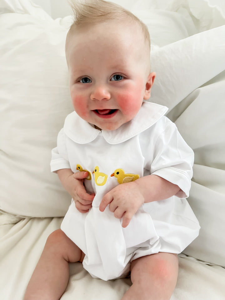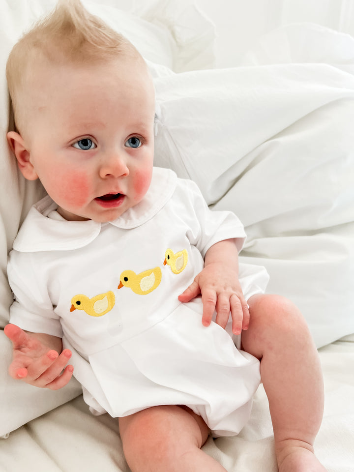The Boy Duck Bubble is a charming and playful outfit, perfect for springtime adventures and family gatherings. Featuring hand-smocked embroidery with adorable duck details, this bubble brings a touch of whimsy and tradition to your little one’s wardrobe. The soft fabric ensures comfort for all-day wear, while the lightweight material keeps them cool and cozy. The buttoned shoulders and gently gathered silhouette make this bubble both practical and stylish, making it an ideal choice for Easter egg hunts, family outings, or seasonal photos. A must-have for your little boy's wardrobe, it combines both style and comfort in one.