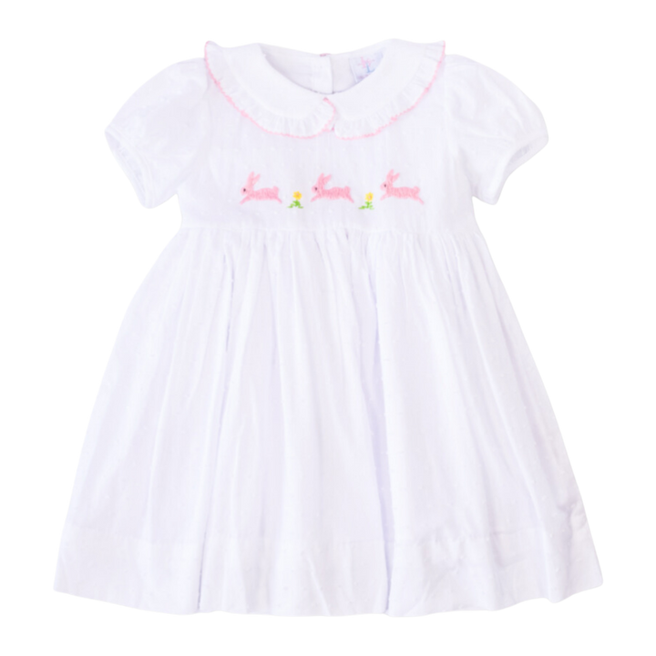 The Brynn Bunny Swiss Dot Smocked Dress is a delightful and timeless choice for Easter and springtime celebrations. Featuring intricate hand-smocked embroidery with sweet bunny details, this dress combines tradition with playful charm. The soft Swiss dot fabric adds texture and a subtle, feminine touch, while the lightweight material ensures comfort for all-day wear. Ruffled sleeves and a gently gathered skirt enhance the classic silhouette, making it an ideal choice for Easter egg hunts, family photos, or special occasions. This beautifully smocked dress is a must-have addition to your little one’s seasonal wardrobe.