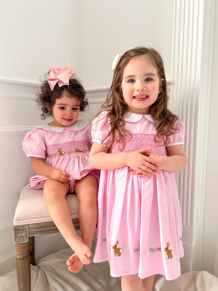 The Evelyn Easter Bunny Pink Smocked Dress is a sweet and festive choice for celebrating Easter and springtime. Featuring delicate hand-smocked embroidery with adorable Easter bunny details, this dress combines classic elegance with playful charm. The soft pink fabric adds a feminine, cheerful touch, while the lightweight material ensures comfort throughout the day. Ruffled sleeves and a gently gathered skirt enhance the dress’s timeless appeal, making it perfect for Easter egg hunts, family photos, and special occasions. This beautifully smocked dress is a must-have for your little one’s spring wardrobe, bringing both style and sweetness to the season.