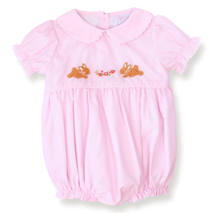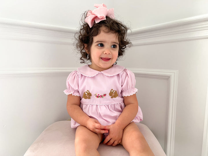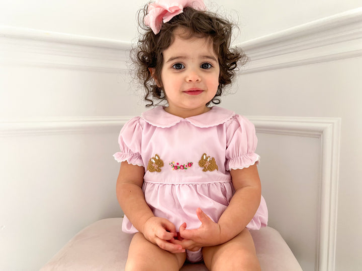 The Cally Bunnies and Florals Pink Smocked Bubble is the perfect outfit for celebrating Easter and the beauty of spring. Featuring delicate hand-smocked embroidery with sweet bunny and floral details, this charming bubble brings a timeless touch to your little one’s wardrobe. The soft pink fabric adds a classic, feminine feel, while the lightweight, breathable material ensures all-day comfort. Ruffled trim and gentle gathers create an elegant silhouette, making it an adorable choice for Easter egg hunts, springtime photos, and family gatherings. Designed for both style and practicality, this precious smocked bubble is a must-have for the season.