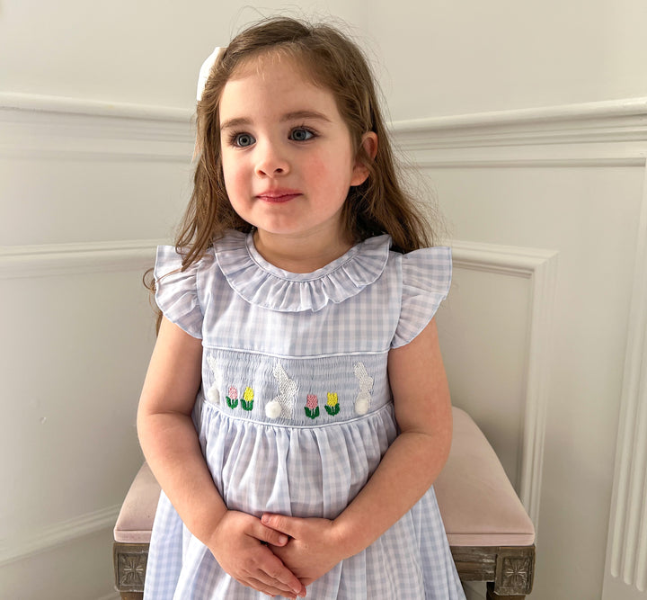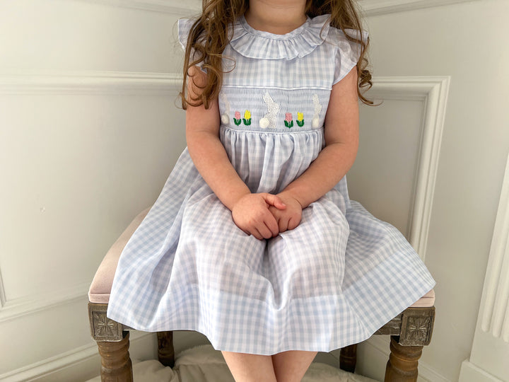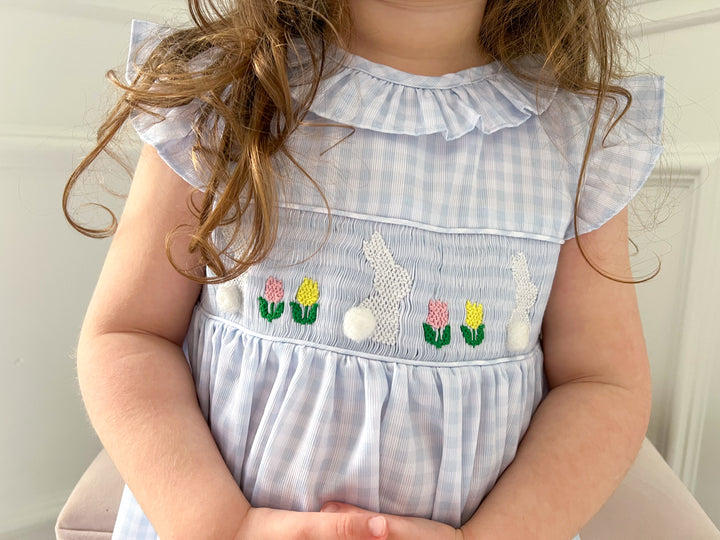 The White Bunny on Blue Gingham Smocked Dress is a timeless and charming choice for Easter celebrations and springtime occasions. Featuring delicate hand-smocked embroidery with an adorable white bunny design, this dress exudes classic sweetness. The blue gingham fabric adds a traditional touch, while the lightweight, breathable material ensures comfort for all-day wear. Ruffled sleeves and a gently gathered skirt create a soft, feminine silhouette, making it perfect for Easter egg hunts, family gatherings, and special moments. This beautifully crafted dress is a must-have addition to any little girl’s seasonal wardrobe.