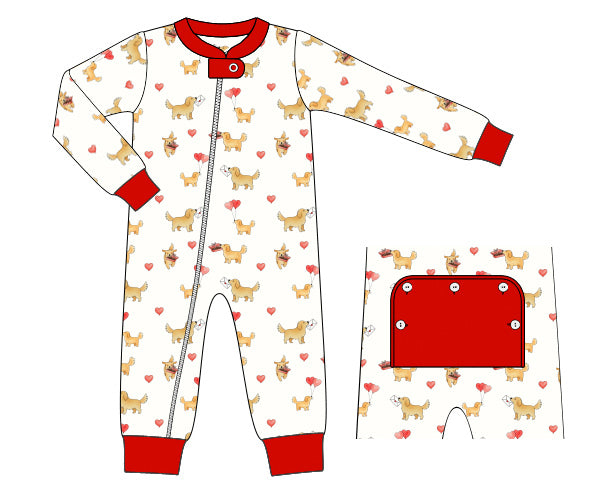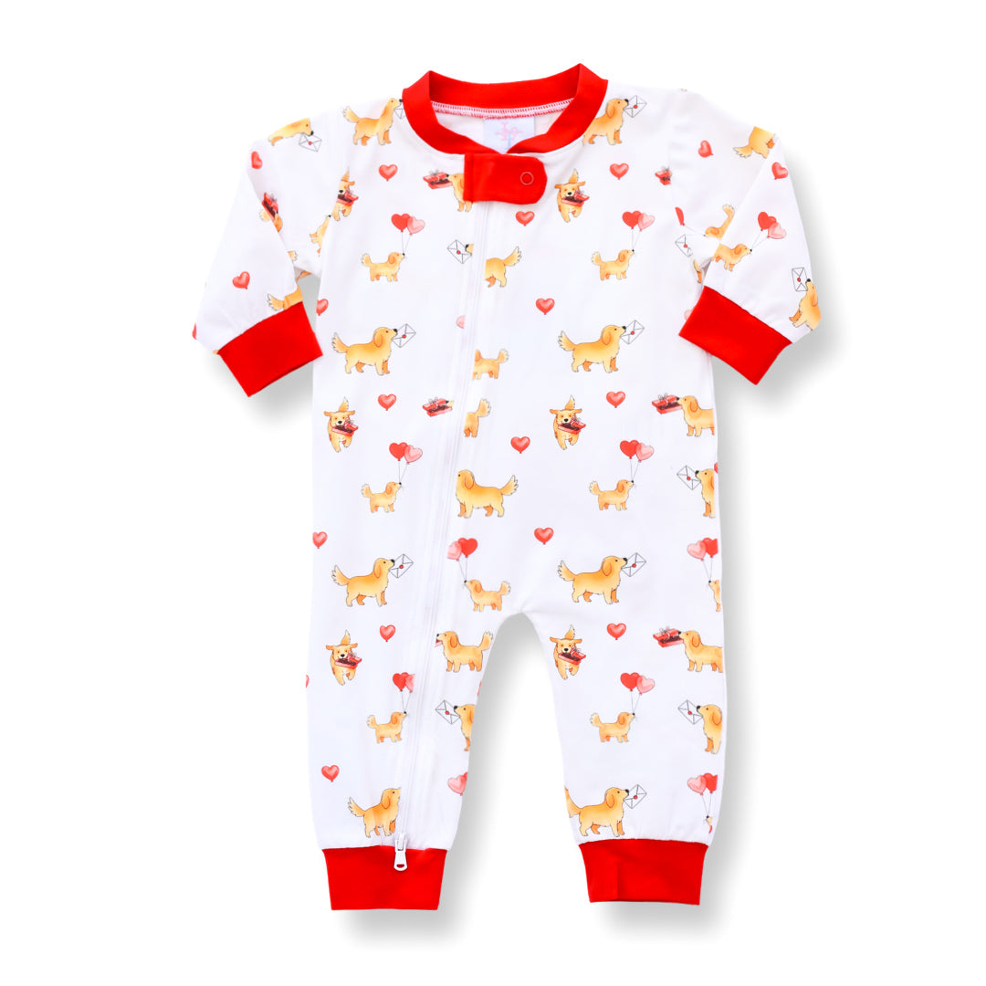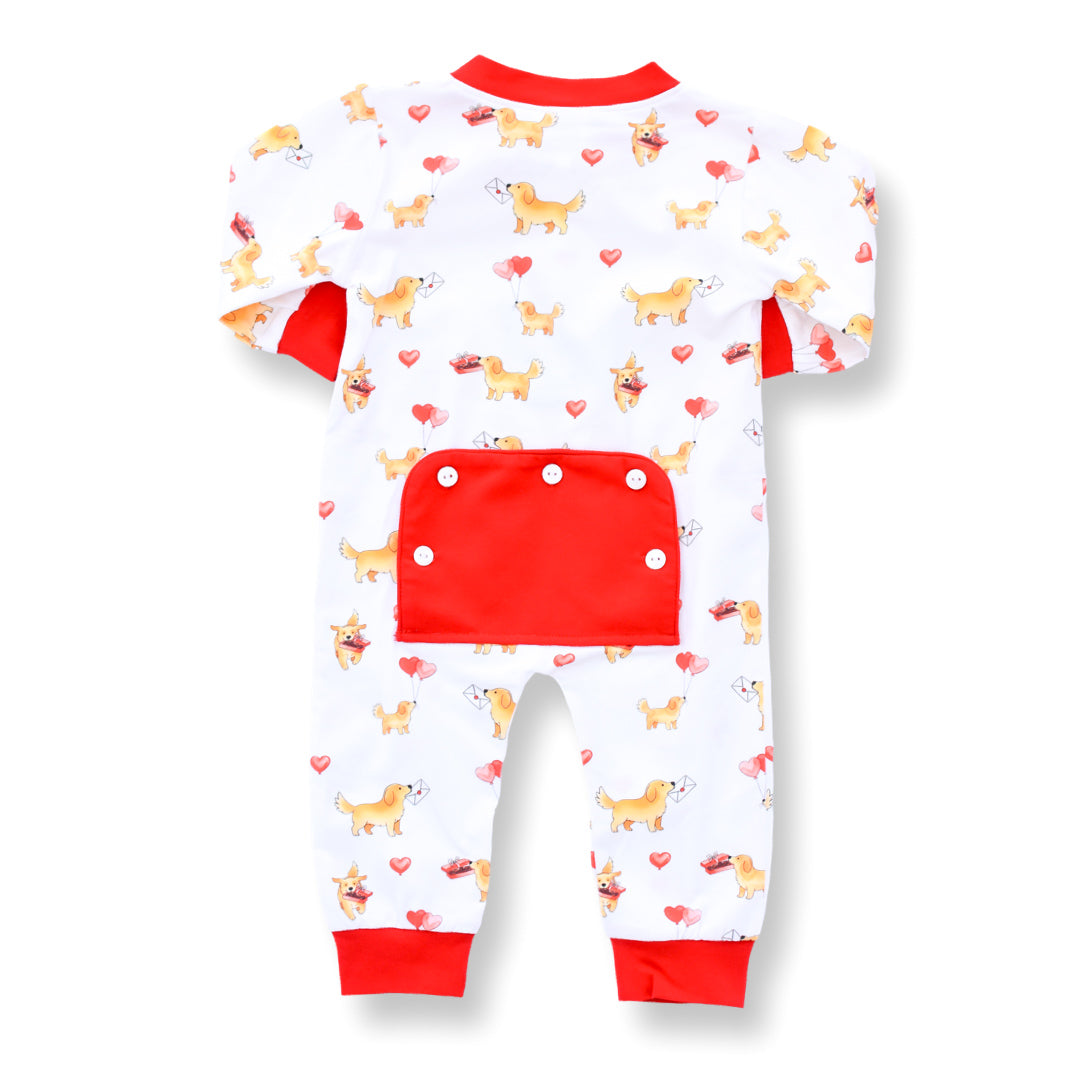Made for sweet dreams and puppy cuddles, the Puppy Kisses Boys Footie combines comfy cotton fabric with a cheerful Valentine pup print. Finished with red trim for a timeless look that’s just right for your little Valentine.