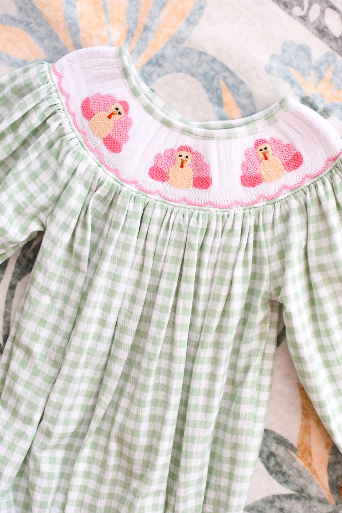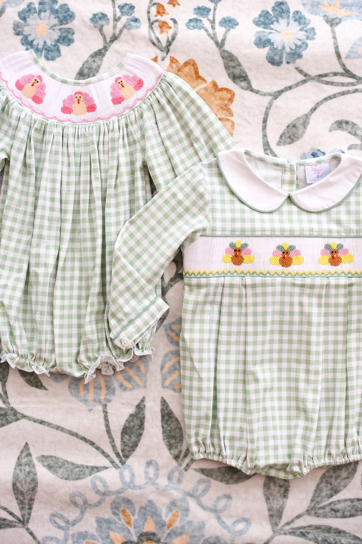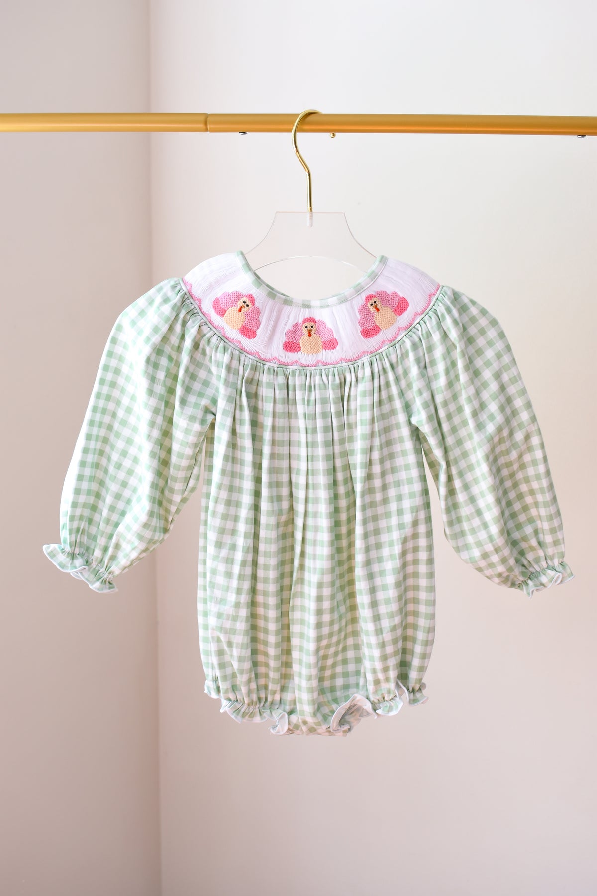 Add a sweet twist to her Thanksgiving wardrobe with this baby girl bubble featuring a charming green gingham print and hand-smocked pink turkeys across the neckline. With long sleeves, soft cotton fabric, and elastic ruffle details, this one-piece is perfect for staying cozy and cute all fall long. A playful and picture-perfect outfit for turkey day festivities, family photos, and seasonal gatherings!