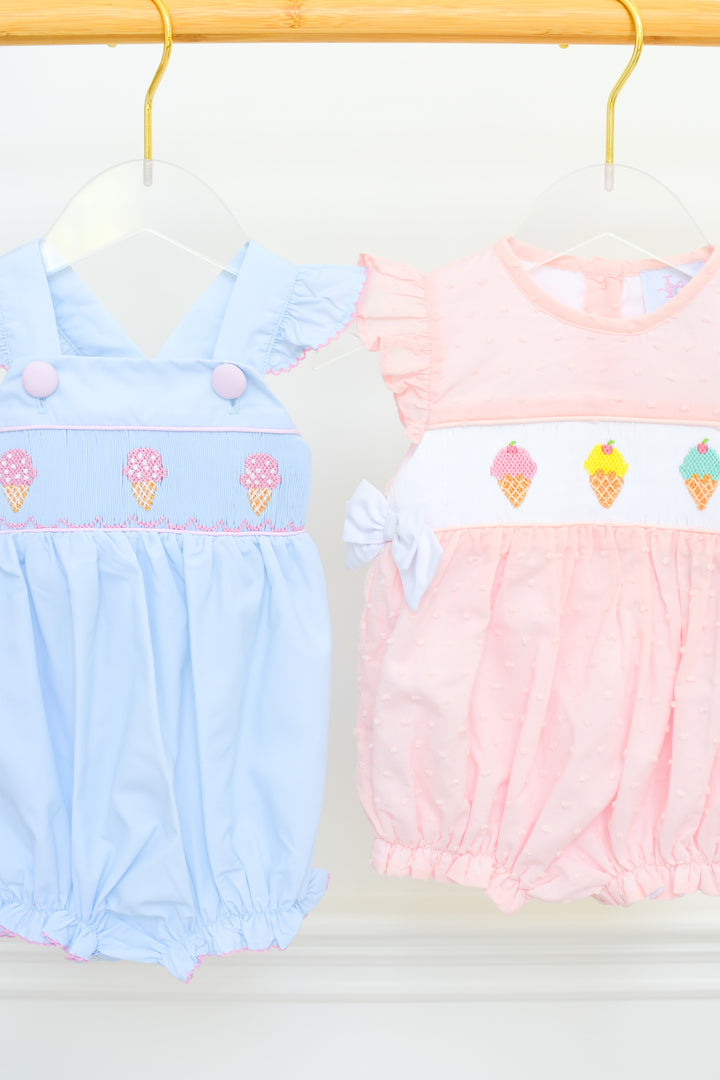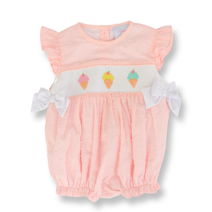 Your little sweetie will be summer-ready in this adorable Peach Smocked Ice Cream Bubble! Featuring three hand-smocked ice cream cones across the chest and sweet bows at the waist, this one-piece is full of charm. The soft peach fabric is lightweight and breathable, perfect for warm-weather adventures, playdates, or ice cream outings. Elastic leg openings and back buttons ensure a comfy fit with easy changes. A must-have for any sunshine-loving little girl!