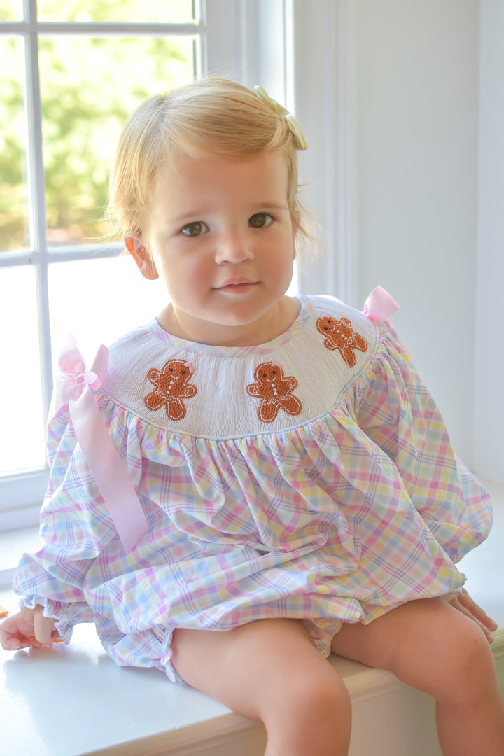 Sweet and festive, our Girls Gingerbread Smocked Bubble is the perfect holiday romper for baby girls. Featuring a soft pastel plaid print, hand-smocked gingerbread girls, ruffle trim, and pretty pink bows at the shoulders, this long sleeve Christmas bubble brings a cheerful twist to traditional holiday style. Perfect for cookie baking, Christmas photos, and baby's first holiday season.