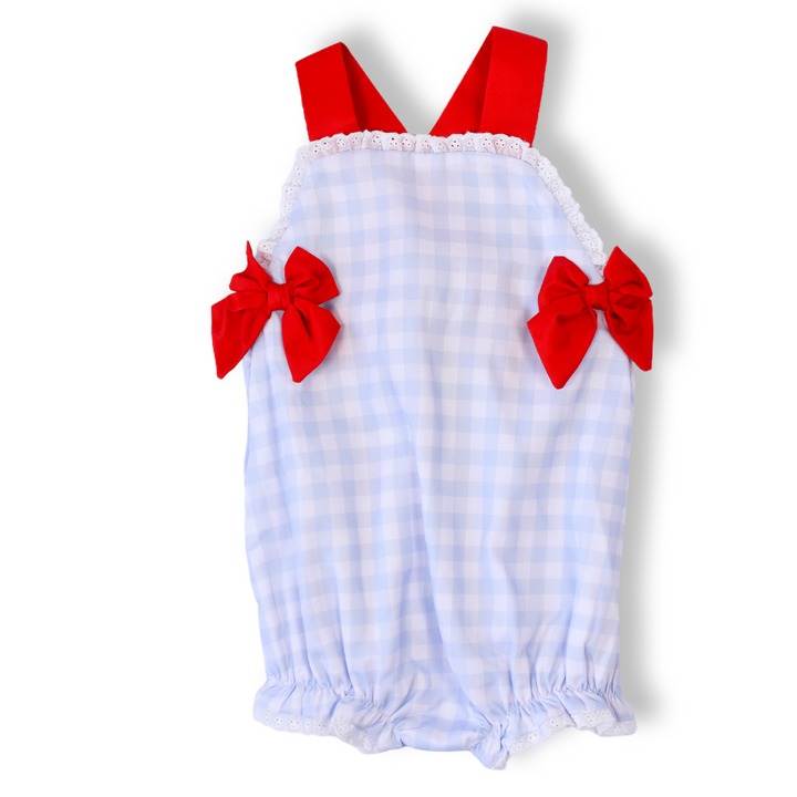This sweet red, white, and blue gingham bubble is perfect for your little one’s patriotic celebrations! Featuring bold red shoulder straps, matching red bows at the sides, and delicate white eyelet lace trim, this outfit blends festive flair with timeless charm. The lightweight fabric keeps baby cool and comfy, making it ideal for 4th of July, Memorial Day, or summer gatherings. Snap closures at the bottom make changes easy. A picture-perfect look for your tiniest firecracker!
