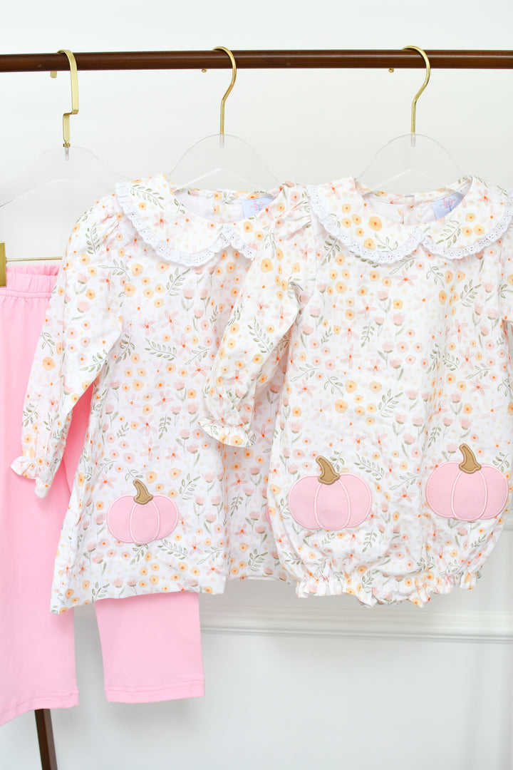 This sweet two-piece set features a delicate fall floral top with pastel pumpkin pockets and soft pink ruffle leggings. A cozy, playful favorite for pumpkin picking, playdates, or a stylish seasonal look.