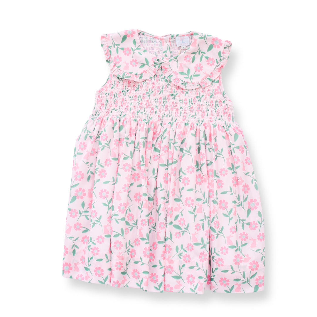 This sweet smocked dress features a soft pink floral print with delicate green accents for a timeless, heirloom look. Hand-smocking across the chest and a ruffled Peter Pan collar add classic charm and elegance. Made from lightweight, breathable fabric, it’s perfect for warm days, special occasions, and everyday wear. A beautiful choice for spring, Easter, family photos, or gifting.