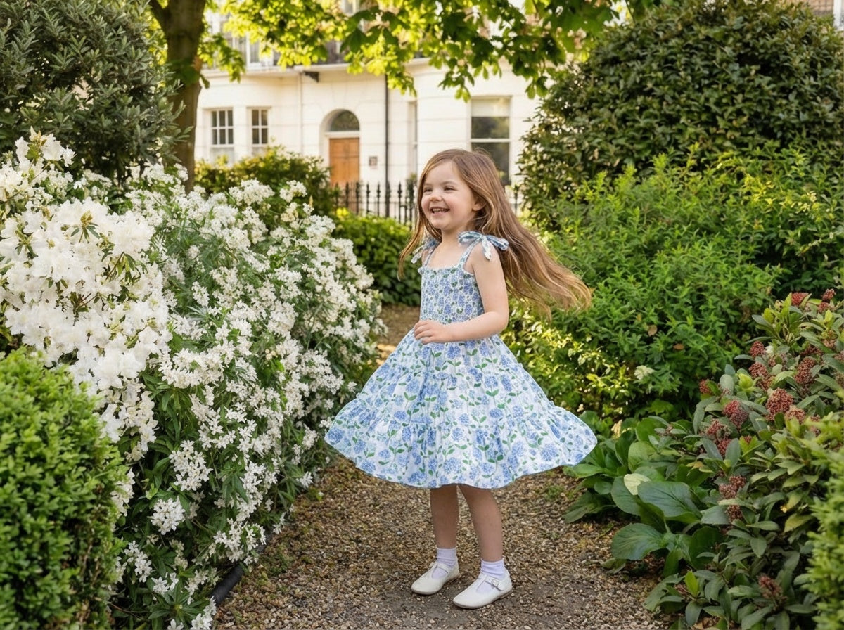 The Marina Dress is a charming, coastal-inspired style made for sunny days and special memories. Featuring a soft blue hydrangea print with fresh green accents, this dress captures the beauty of New England summers in the sweetest way.