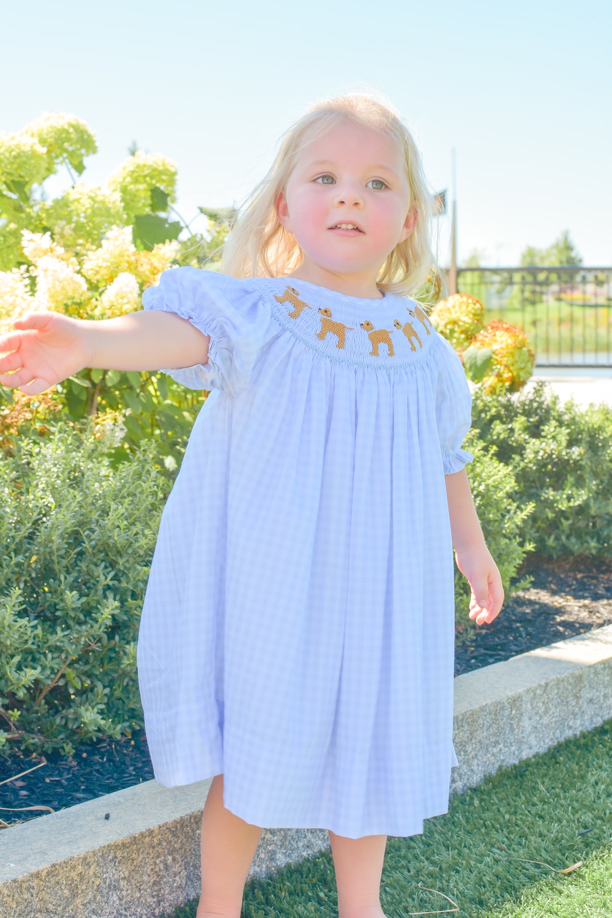 This Girls Puppy Smocked Dress is full of tail-wagging charm! Made with classic blue gingham, this short sleeve dress features hand-smocked tan puppies across the chest, puff sleeves with ruffle trim, and a sweet heirloom silhouette. Perfect for dog lovers, park days, or sibling matching moments, it’s an adorable pick for any season.