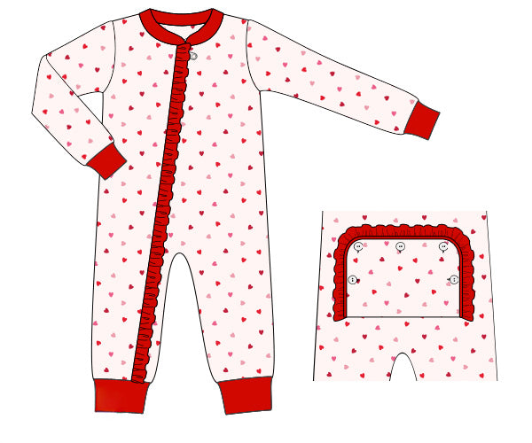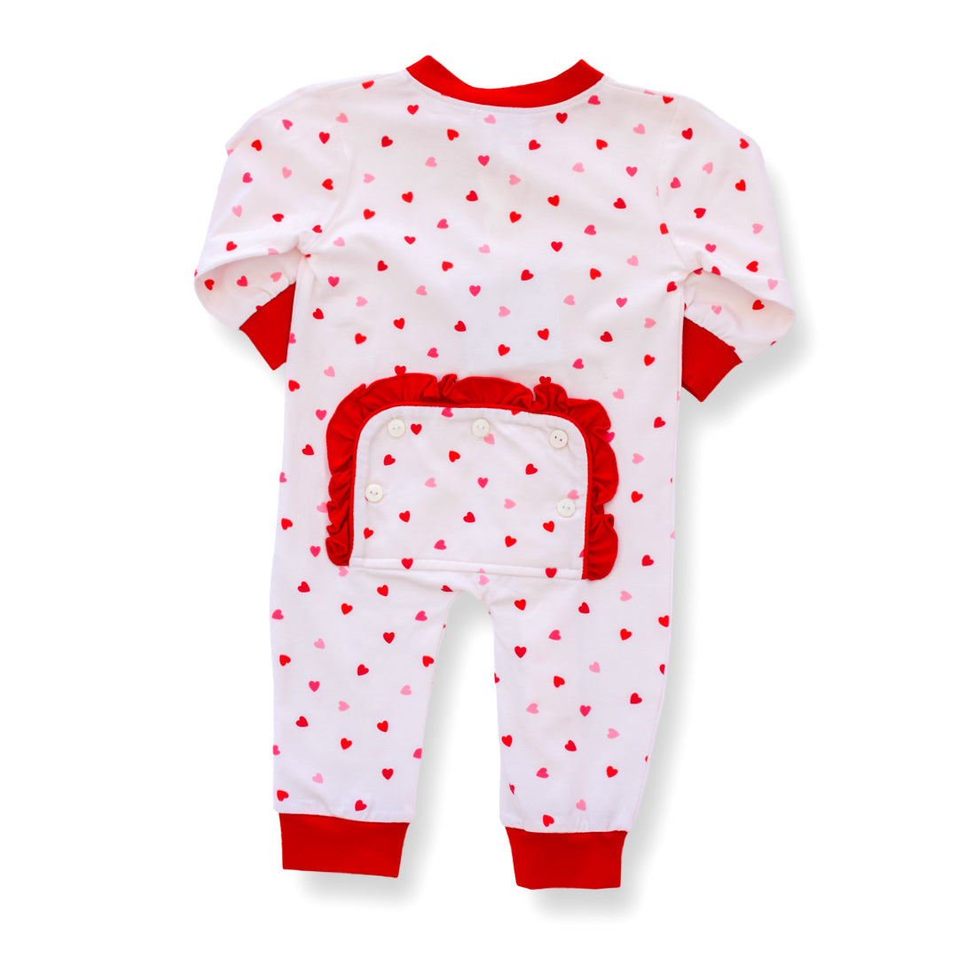 Snuggle season is sweeter in our Be My Valentine Footie! Covered in tiny red hearts and finished with ruffled trim and bright red cuffs, this cozy one-piece is made for Valentine mornings, bedtime cuddles, and matching sibling moments.
