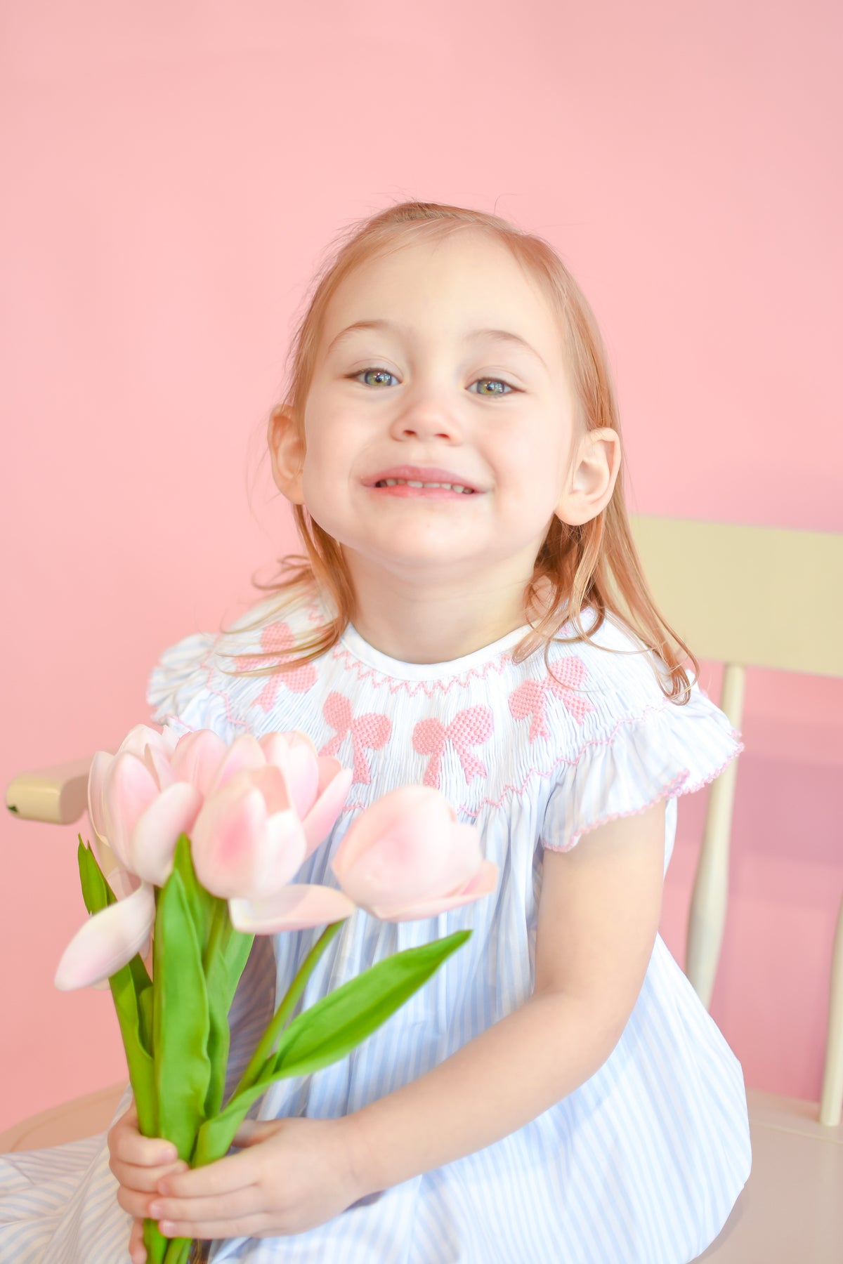 Timeless and treasured, The Eleanor Dress captures the beauty of classic Southern style. Delicate pink smocked bows adorn the neckline, framed by flutter sleeves and soft blue pinstripes for a look that’s as sweet as springtime itself. Perfect for portraits, parties, and every precious moment in between — this heirloom favorite will be adored for seasons to come.
