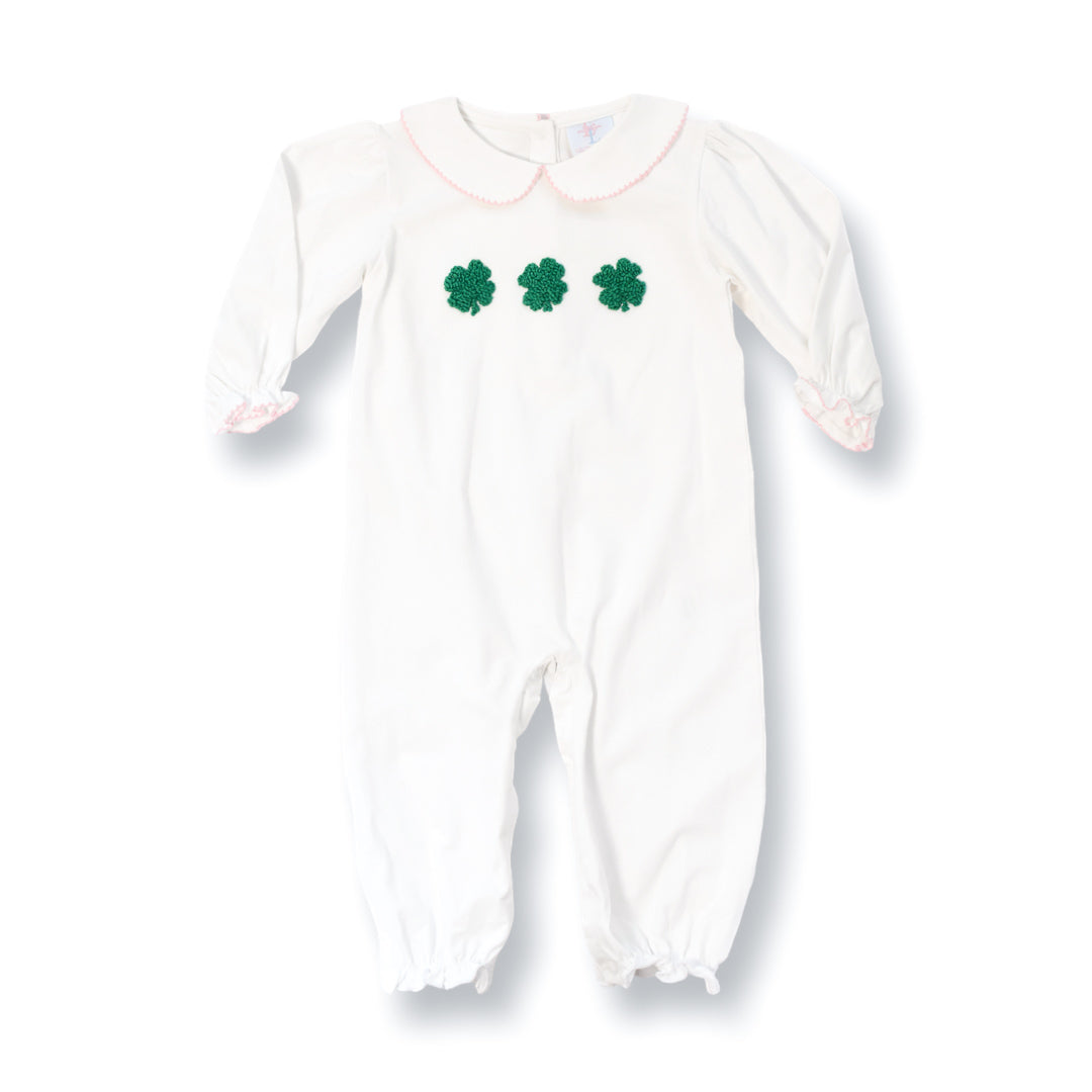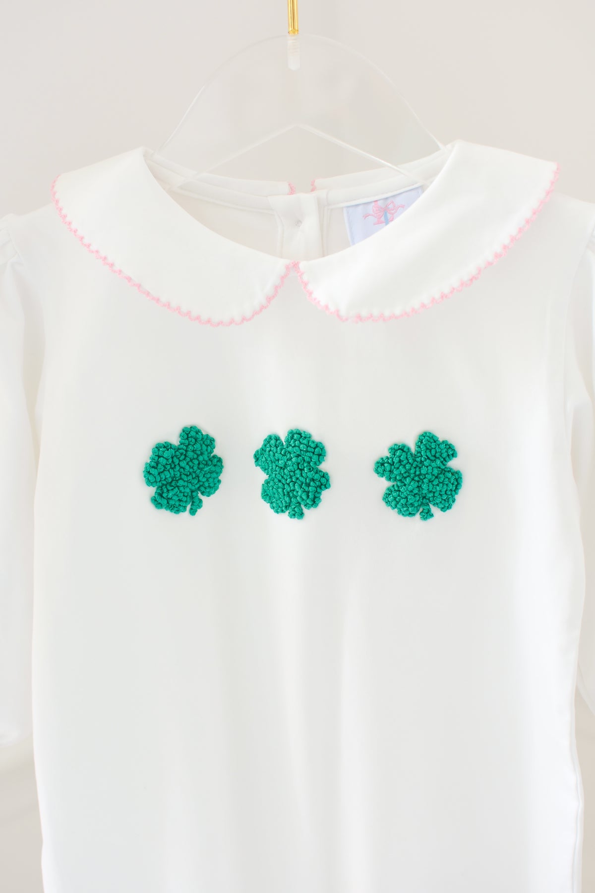 Designed in cozy white cotton with french knot green clovers, pink picot trim, and a classic Peter Pan collar, it’s the perfect blend of timeless and festive. A darling choice for St. Patrick’s Day photos, spring outings, or special first milestones.