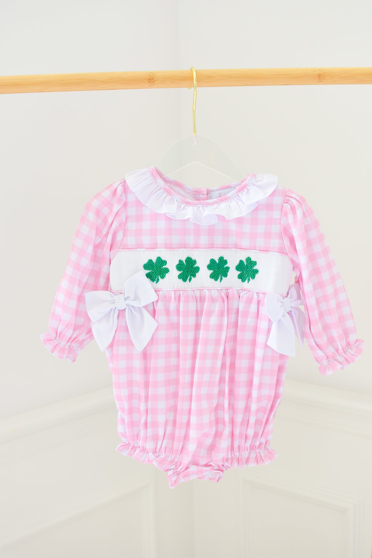 Bring a touch of Irish charm to your little one’s wardrobe with our Nora Bubble. Designed in soft pink gingham with hand-smocked green clovers and finished with white bows and ruffled trim, this darling style blends festive spirit with feminine sweetness. Perfect for St. Patrick’s Day celebrations, spring photos, or matching big sister in The Nora Dress.