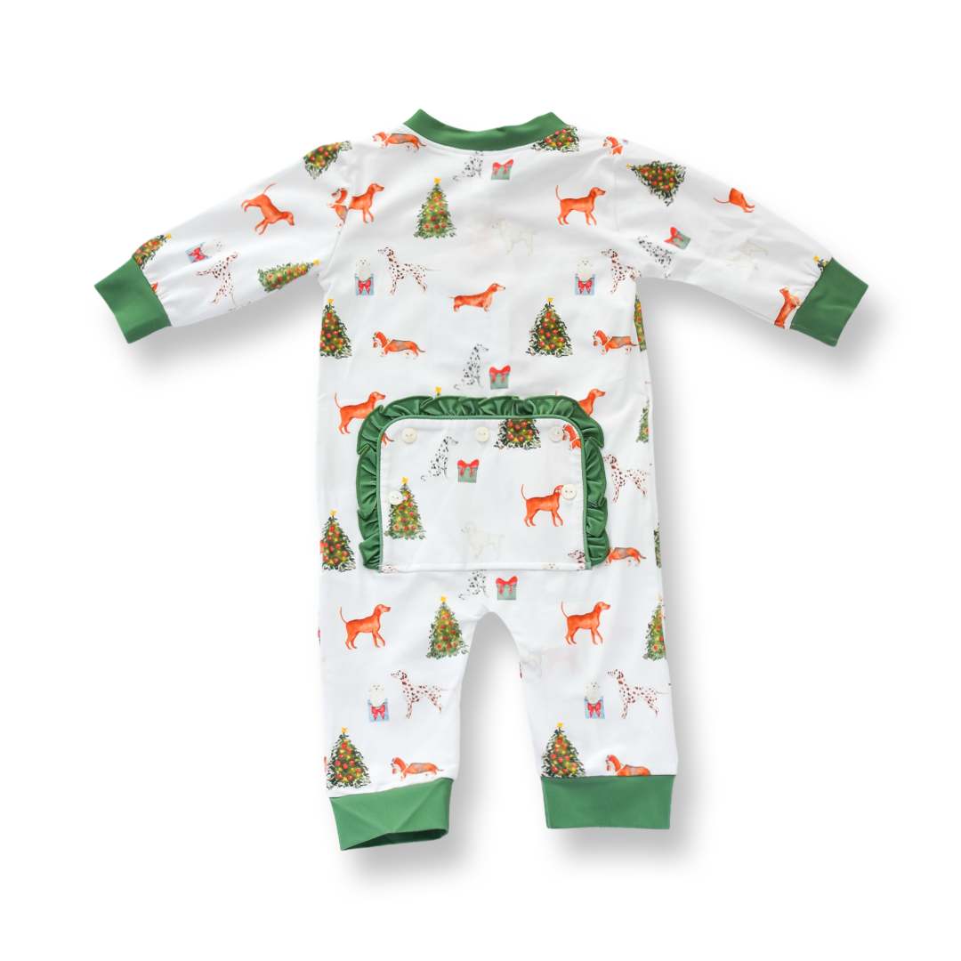 Snuggle up in paw-liday style! This adorable holiday zipper romper features a playful dog-themed print with festive pups, Christmas trees, and presents. Designed with green trim and a functional rear flap detail, it’s both cozy and photo-ready. Perfect for Christmas morning cuddles, holiday cards, or matching with the whole family’s pet-friendly style. A must-have for little animal lovers this season!