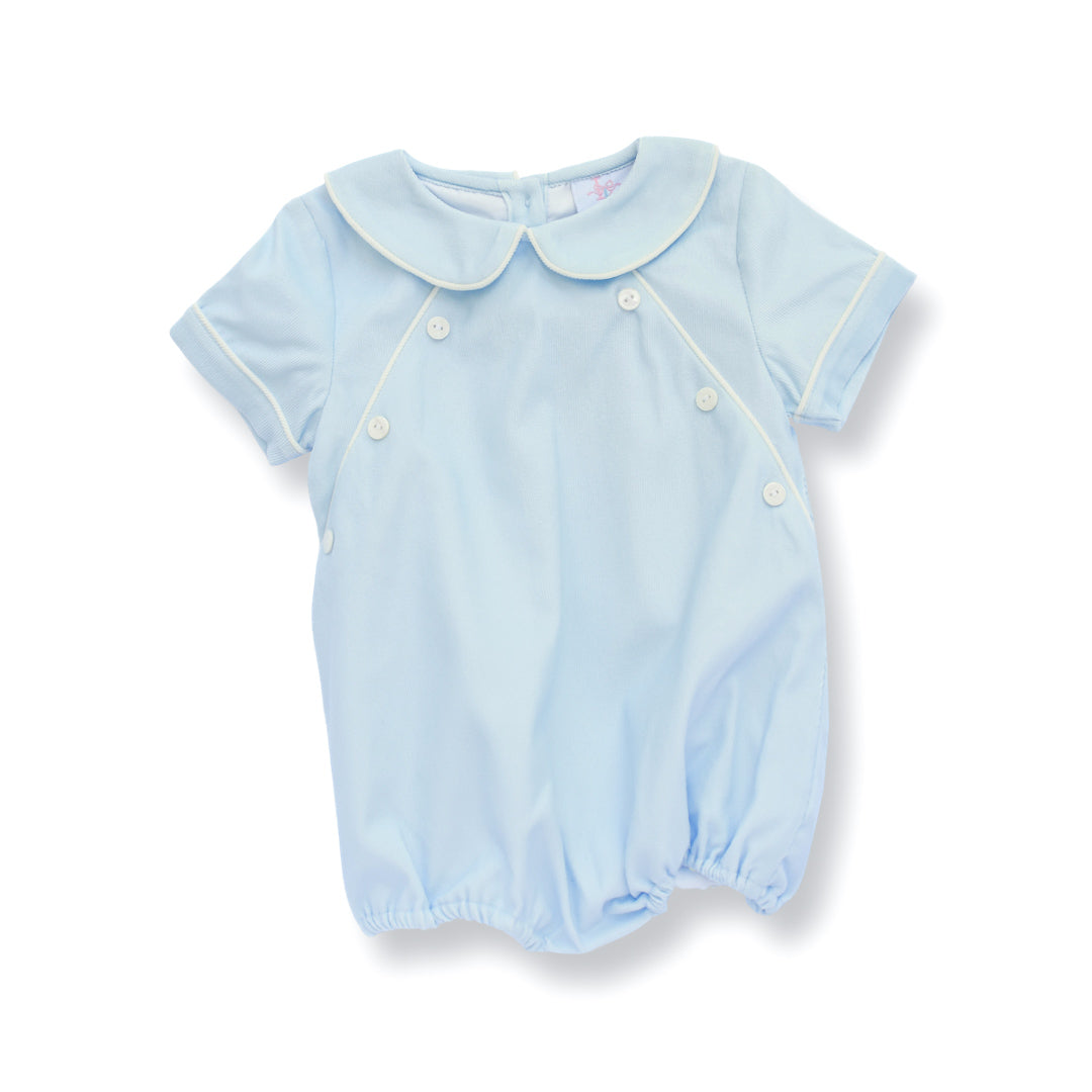 Our Classic Blue Button Baby Bubble is a timeless must-have for your little gentleman. Designed with soft, breathable fabric, this baby boy romper features a traditional Peter Pan collar, charming button details, and elegant piping for a vintage-inspired look. Perfect for summer events, special occasions, or everyday charm. Snaps at the bottom make for easy changes. A sweet and stylish addition to any baby boy's wardrobe.