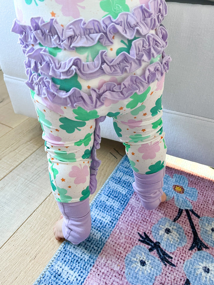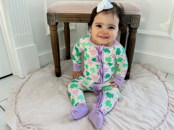 Our Four Leaf Clover Ruffle Footie is soft and perfect for all seasons! Diaper and outfit changes are a breeze with the double zipper. Plus, adjustable cuffs for easy hands and feet coverage.
